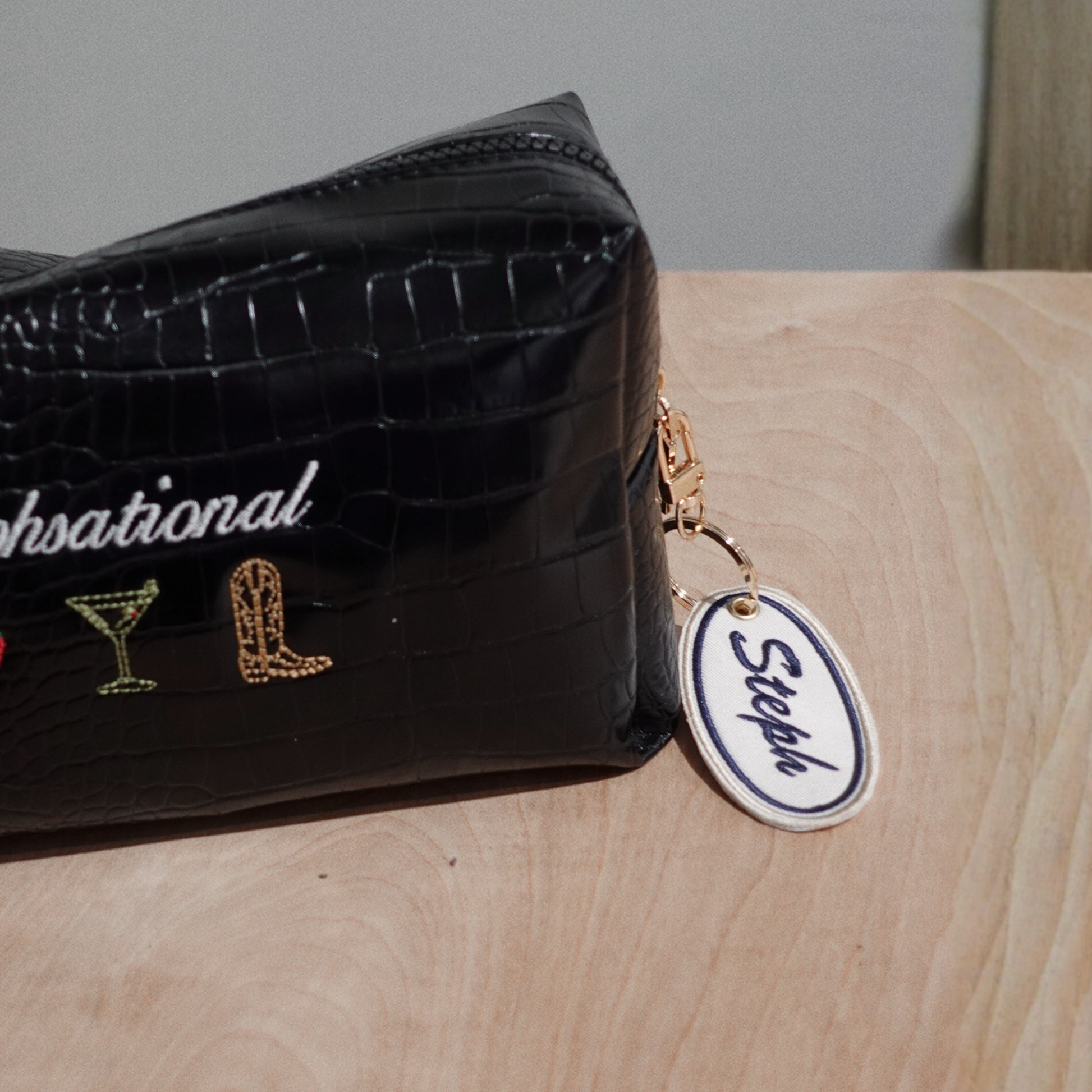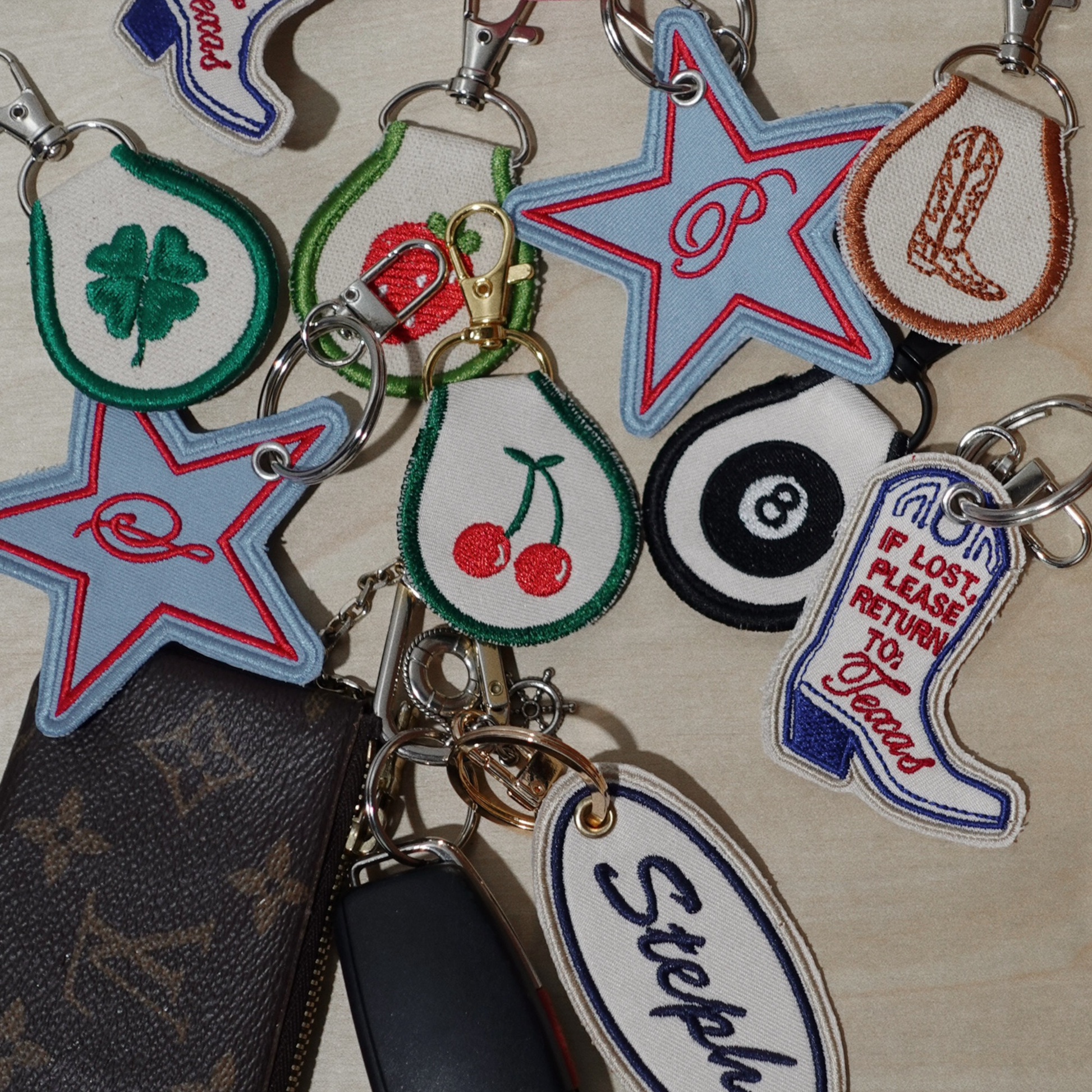 Custom retro key tags available in different thread color outlines and font color. Hardware will vary between gold or silver. Approximately 2.5 inches wide.