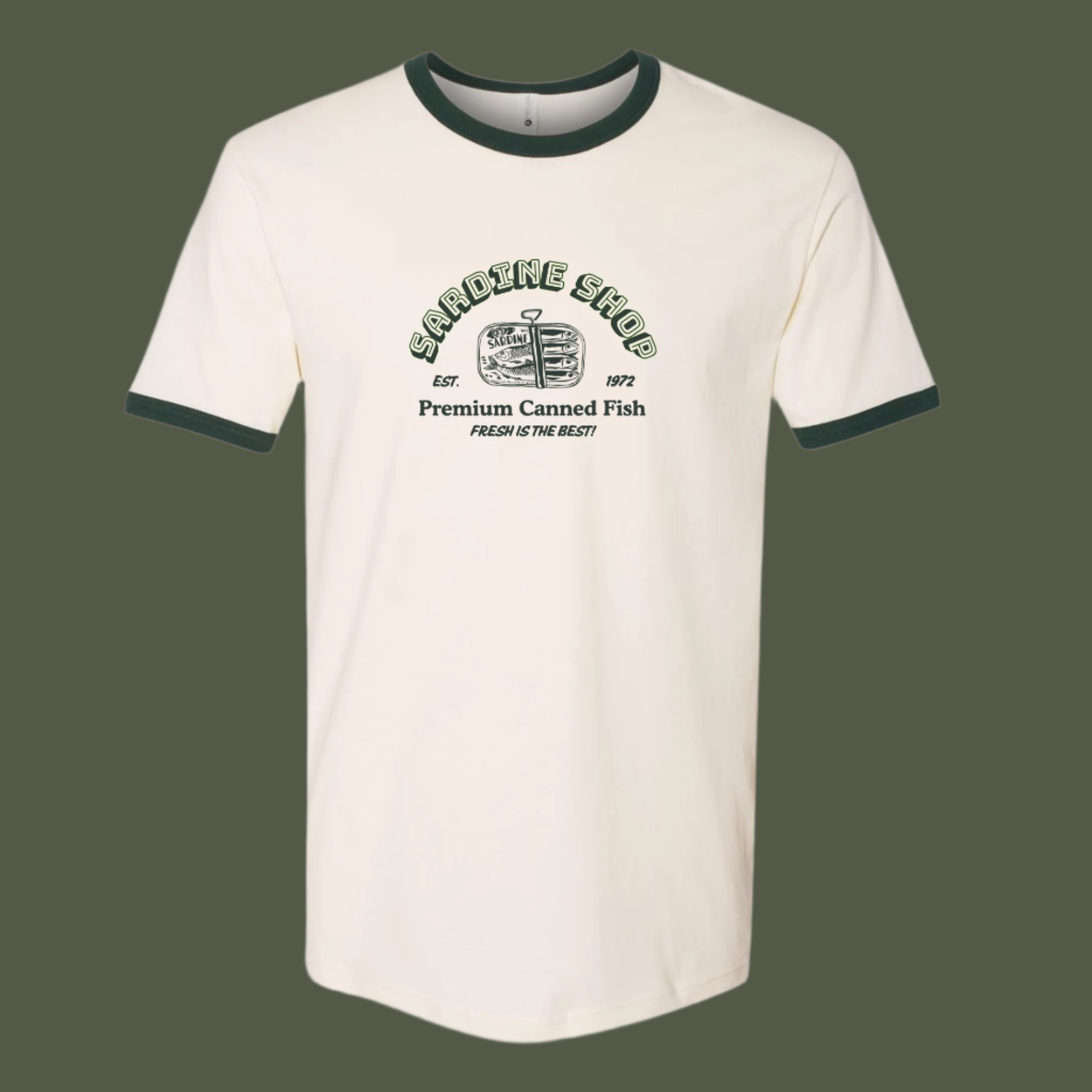 Screen printed design on forest green and cream ringer tee. Unisex sizing.