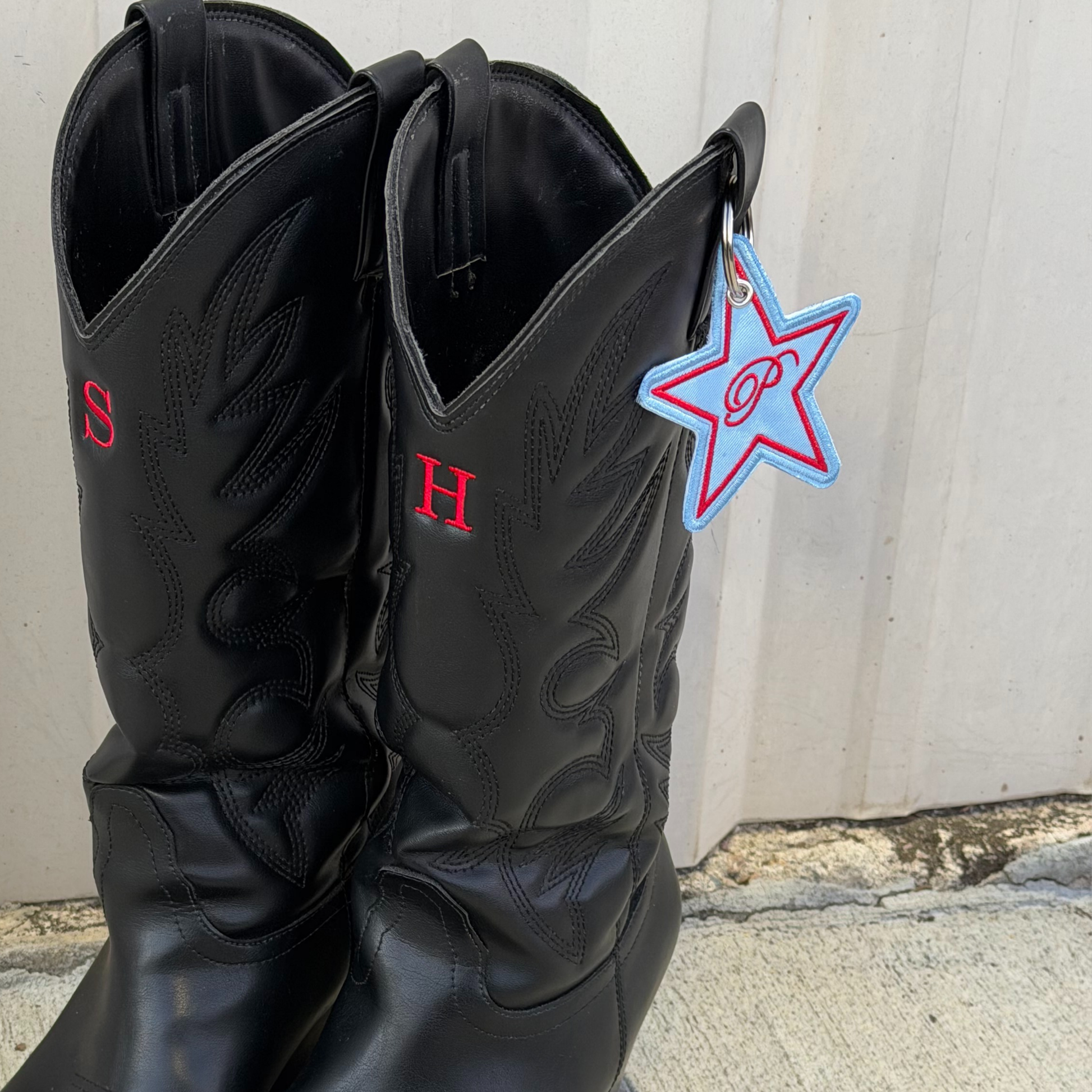 Custom initial star-shaped keytag. White or red thread color available for font. Hardware will vary between gold or silver. Approximately 2.5 inches tall.